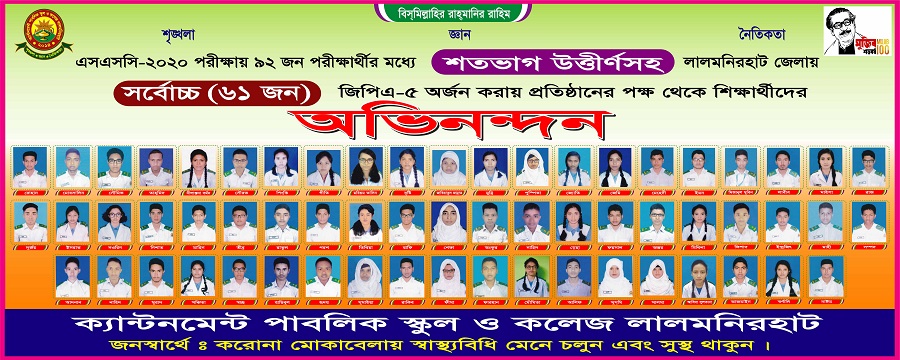 Cantonment Public School and College secured the topmost position in Lalmonirhat District for the SSC result-2020. 61 students got GPA 5 out of 92 candidates with 100% pass this year.The head of the institution, the Principal expressed his feelings saying, “Any institution will reach its goal if the institution, students, teachers and guardians become sincere and work exactly according to proper guidance”.